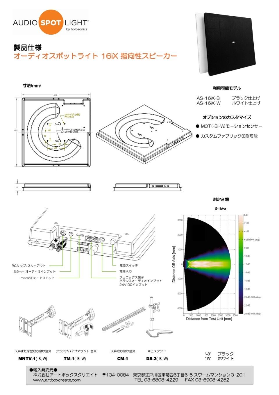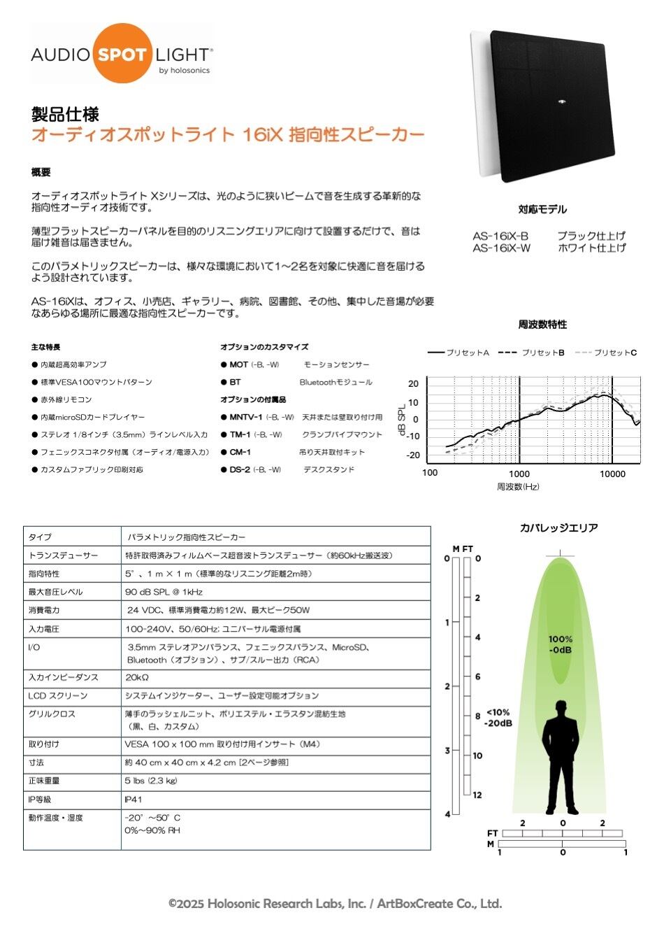 Audio Spotlight Xシリーズは、光のように狭いビームで音を作り出す革新的な指向性オーディオ技術です。薄型でフラットなフォーカスサウンドスピーカーパネルを希望のリスニングエリアに向けることで、ノイズを一切排除し、サウンドを最大限に引き出します。™ AS-16iXは、当社の最も人気のあるAudio Spotlightモデルで、クリアで臨場感あふれるスピーチや音楽を再生できます。このパラメトリックスピーカーは、静かな環境で1人または2人を快適にターゲットにするよう設計されています。AS-16iXは、オフィス、高級小売店、ギャラリー、待合室、病院、図書館、そしてご家庭に最適な指向性スピーカーです。